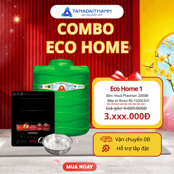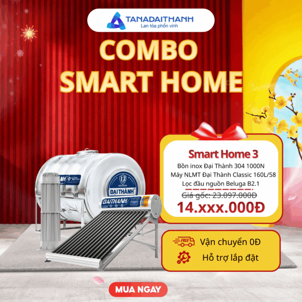 Combo smart home SH04 – Trọn bộ thiết bị nước sạch, tiện nghi và tiết kiệm cho gia đình hiện đại. Kết hợp 3 thiết bị thiết yếu: bồn inox Đại Thành Classic 1000L ngang, máy nước nóng năng lượng mặt trời Classic 180L (ống Φ 58), máy lọc nước RO Smart 9 lõi, đây là combo hoàn chỉnh giúp gia đình bạn yên tâm về nguồn nước sạch – an toàn – tiết kiệm điện, từ đầu vào đến bữa ăn hằng ngày.