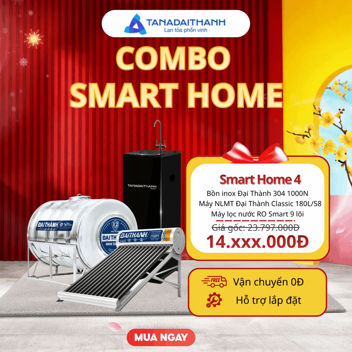 Combo Smart Home 4 bao gồm bộ 3 thiết bị quan trọng của cuộc sống gồm bồn inox SUS 304 Đại Thành Classic 1000L ngang, máy năng lượng mặt trời Đại Thành 180/58 và máy lọc nước Tân Á RO Smart 9 lõi. Sự kết hợp của các thiết bị này tạo nên một combo hoàn chỉnh giúp nâng cao chất lượng cuộc sống.